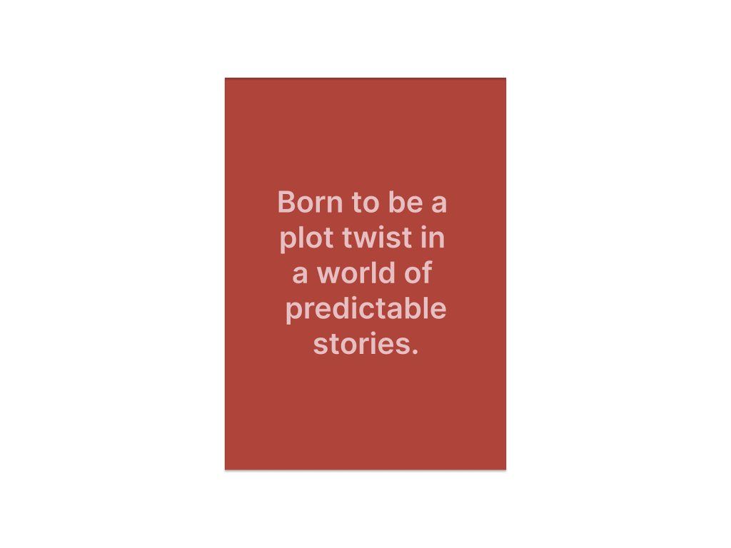 Pohlednice Plot Twist je připomínkou toho, že ty nejlepší příběhy začínají nečekaným zvratem. Byla vytvořena pro ty, kteří milují dobrodružství a nebojí se změn. Je to ideální doplněk, který dodá styl prostoru a připomene vám, že každý konec je jen začátkem něčeho nového.